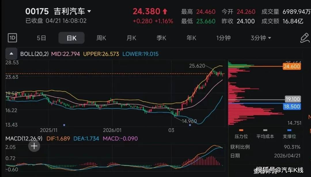 从3月初的约15港元,到4月17日的24.72港元(最高一度突破25港元),吉利汽车(0175.HK)股价一个多月飙涨超65%,市值攀升至2670亿港元,涨幅领跑港股汽车板块。